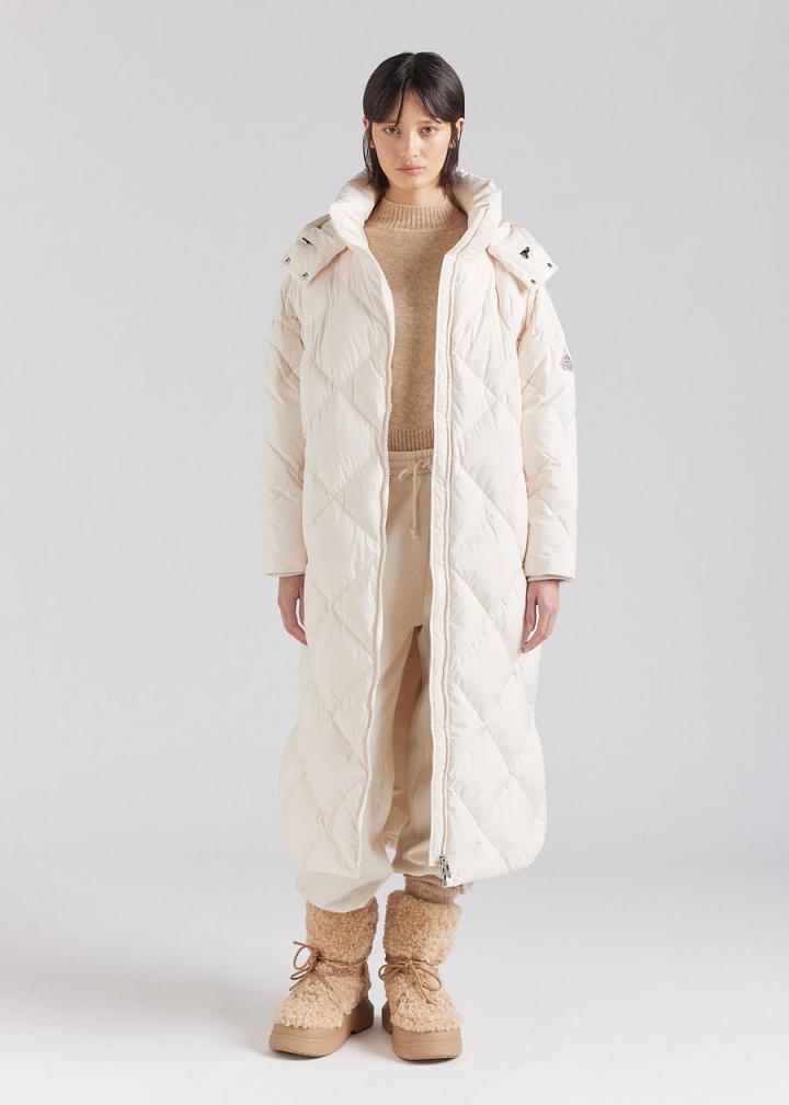 Une doudoune femme ultra longue et enveloppante. Le manteau en duvet naturel Adèle Coat est parfait pour affronter le grand froid de l’hiver. Cette veste chaude pour femme s’adapte aussi bien à des looks urbains qu’à des tenues plus sportives et outdoor. Son tissu doux et mat, « effet peau de pêche », doté de propriétés déperlantes, vous protège des légères pluies tout en offrant un aspect élégant et minimaliste. Généreusement garnie de duvet naturel, cette doudoune est idéale pour vous garder au chaud de la tête aux pieds. Son piquage croisé ajoute une touche contemporaine qui se marie parfaitement avec tous les looks. La capuche est amovible. Température indicative d’utilisation : +0C à -20C. Zip frontal avec tirette double sens et sous-patte de protection. Capuche amovible, réglable par cordon élastique et stoppeurs. Bord-côte tricoté à l’intérieur des poignets. Deux poches avec zip. Poche intérieure avec zip. Badge Pyrenex vintage sur la manche gauche.